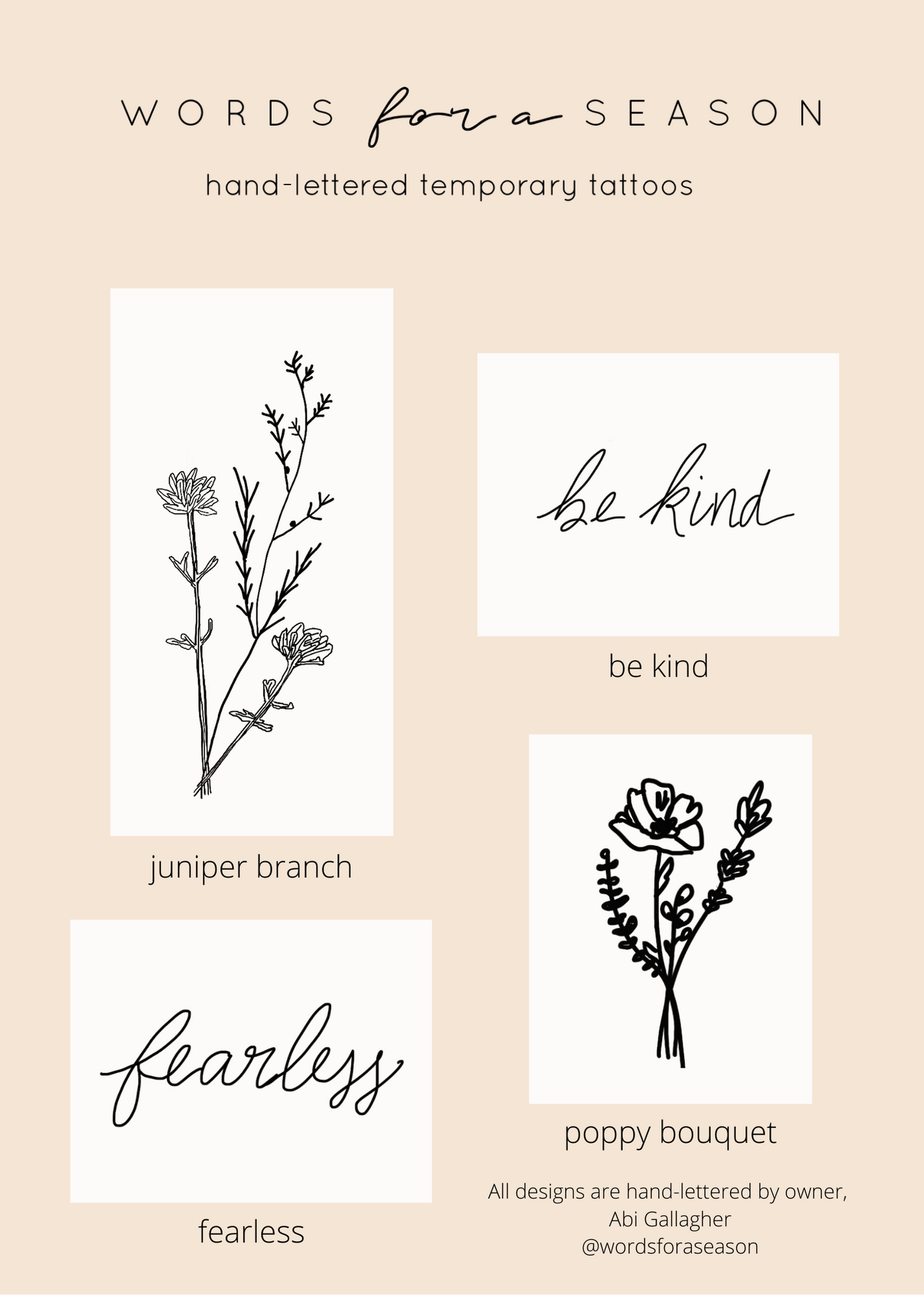 A multipack of beautiful, hand lettered tattoos. These tattoos are beautiful and the perfect accessory to any outfit!