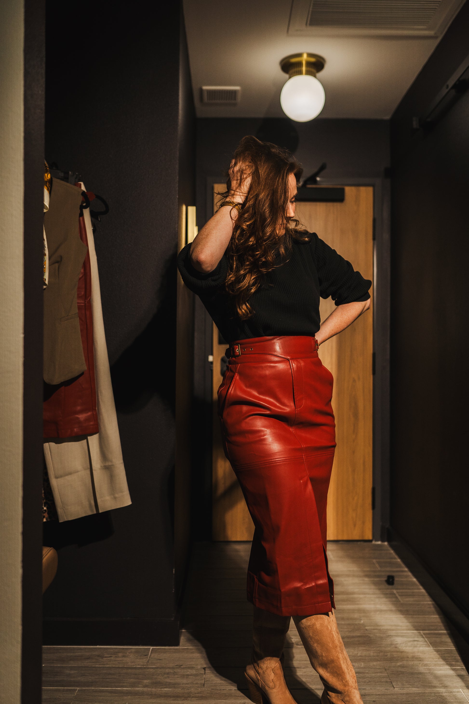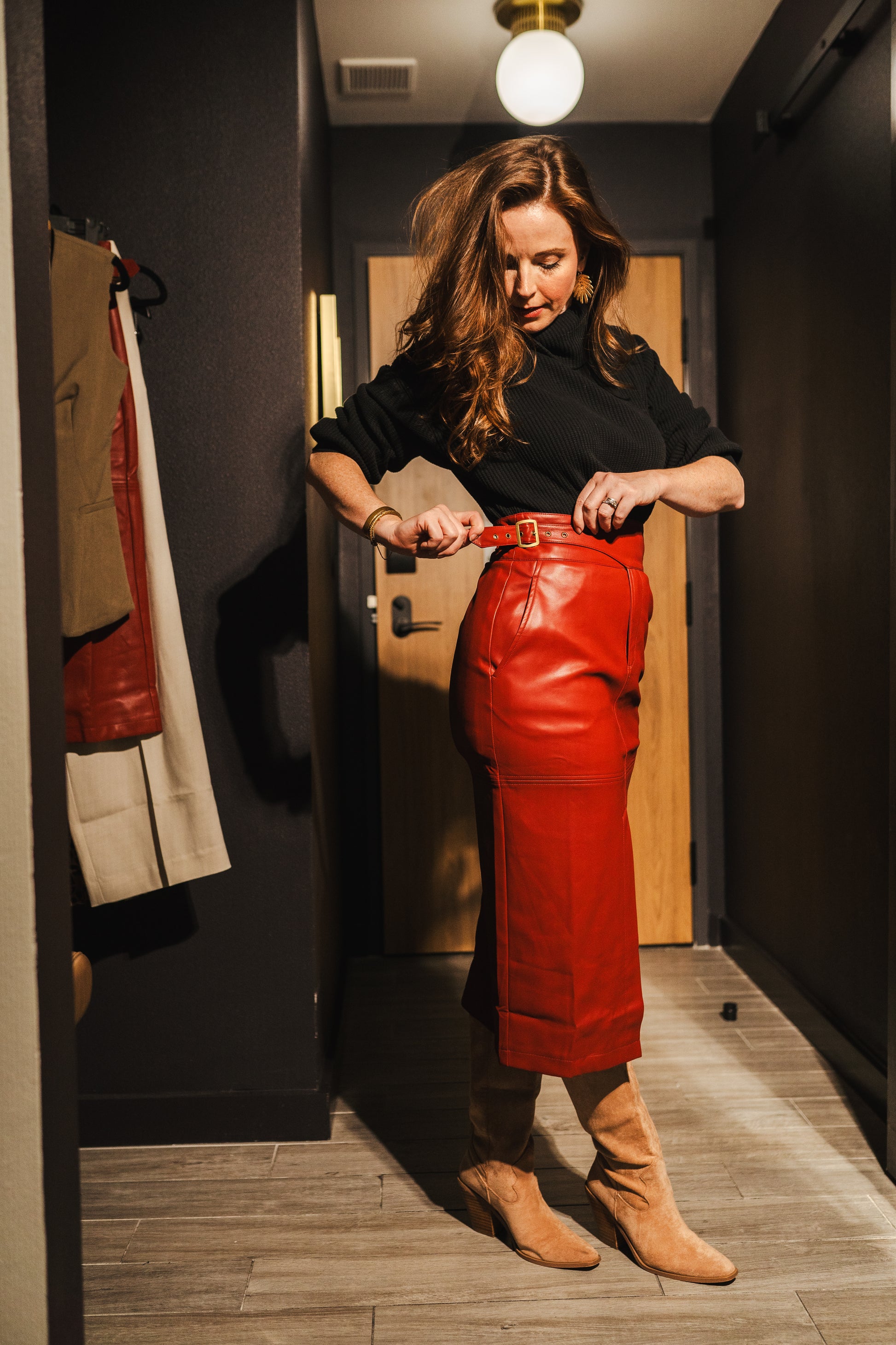 This vegan leather skirt is the perfect shade of red. The buckle detail adds a unique touch! It pairs well with a chunky sweater and boots!