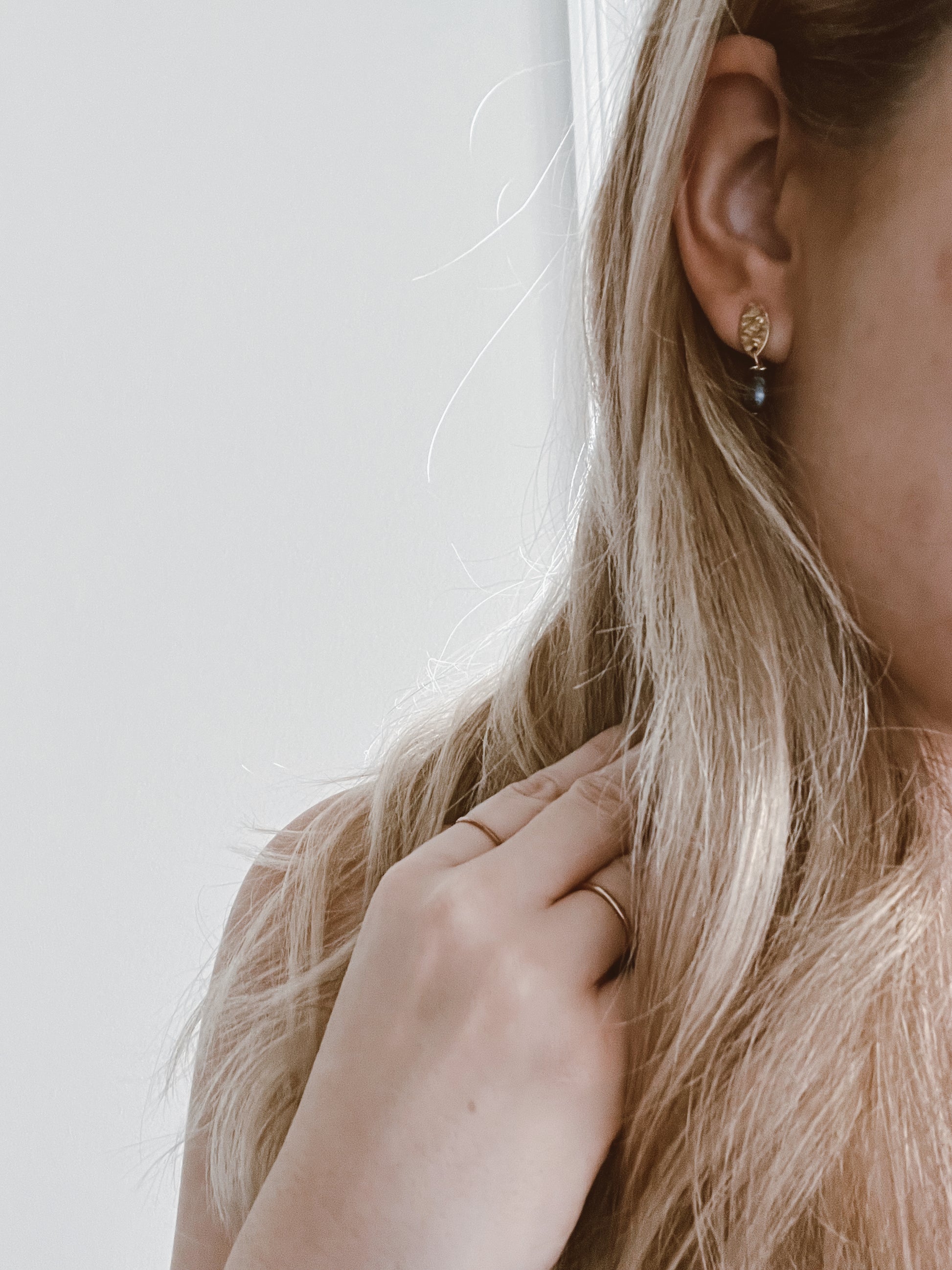 These dainty earrings are beautiful! The textured top and pearl add a unique detail. The pearls are authentic black pearl. All jewelry is hypoallergenic and water proof.