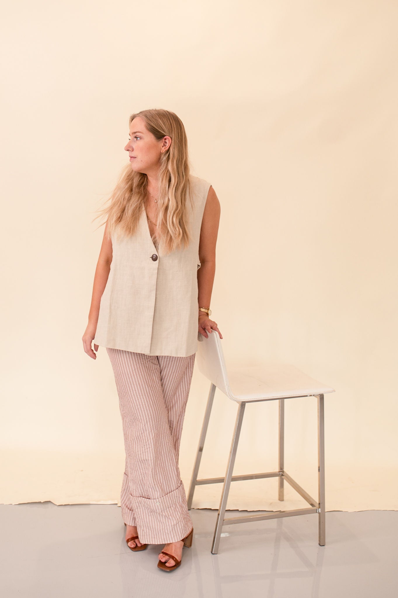 This vest is beautiful, classic and perfect for summer! The slide slit detail adds a unique touch. Pair with the "classic yellow shorts" for a subtle pop of color or light wash denim. Style up or down and wear any season.
