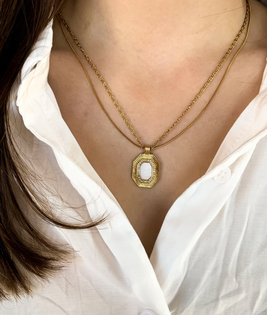 Double stainless steel chain with opalescent pendant makes the gorgeous single necklace that looks like a double necklace.