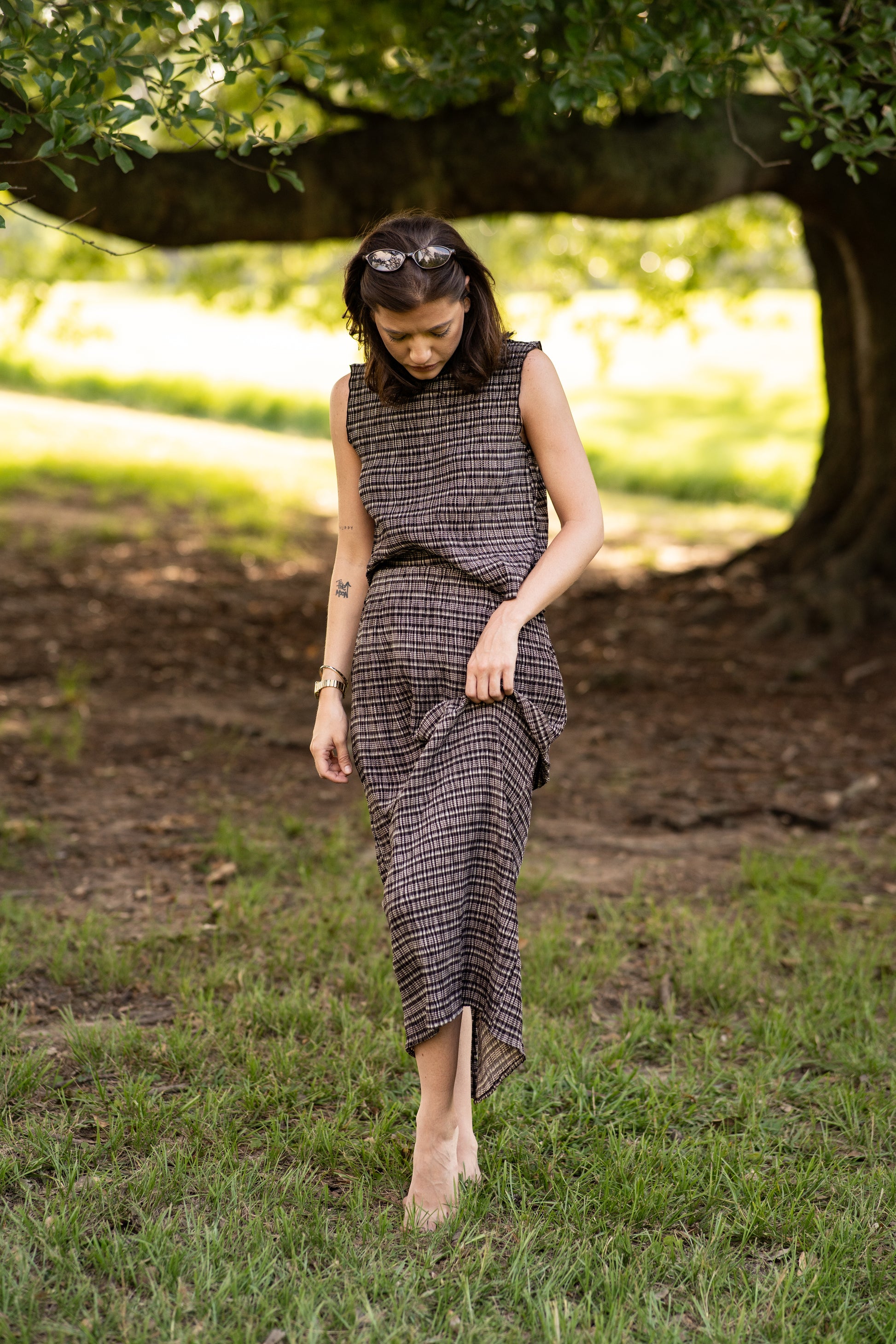Brown is a great neutral on most people. The crinkle and plaid detail adds a unique touch.