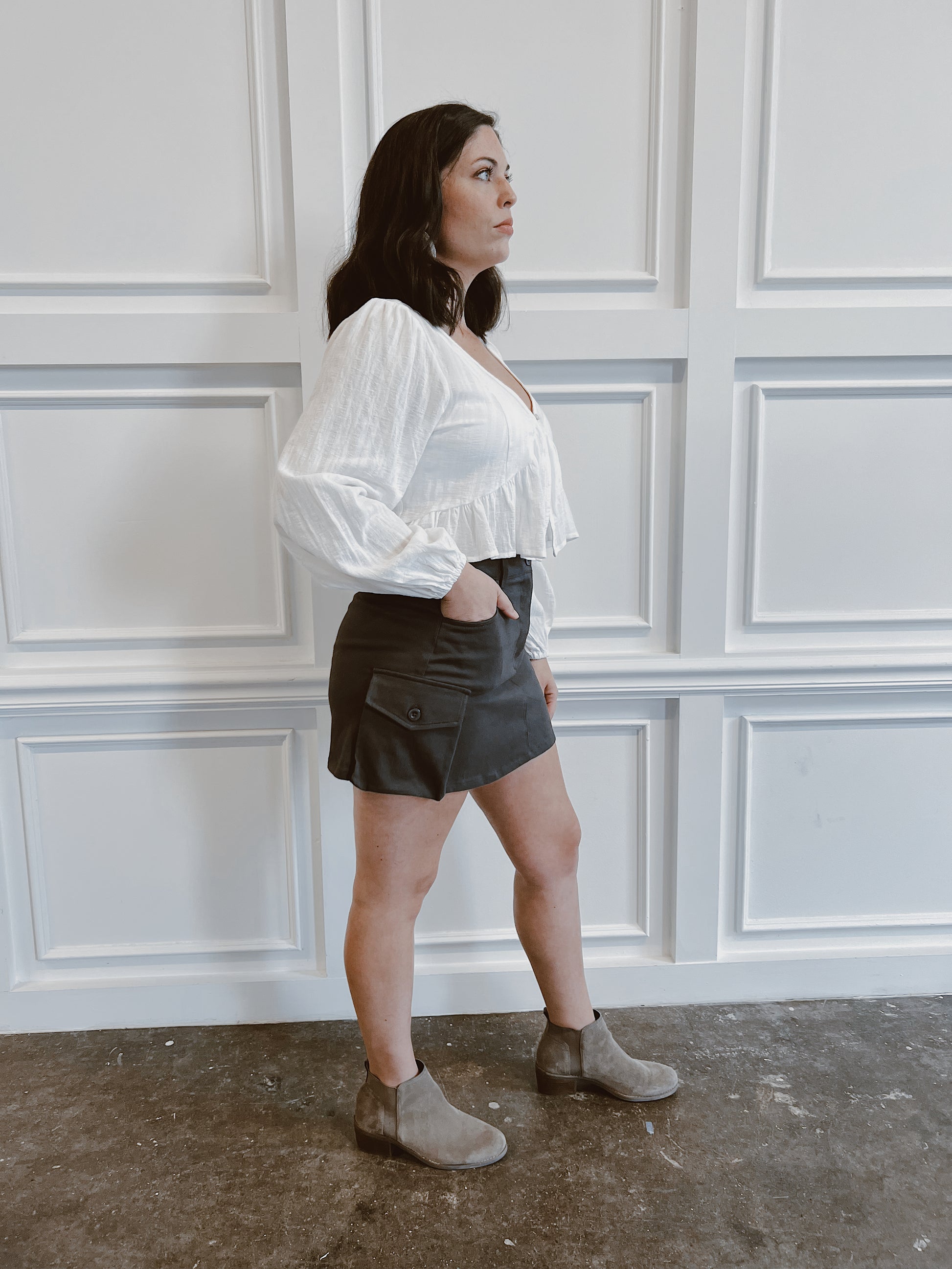 This cargo skirt is your new closet staple. It looks cute dressed up with mules, or dressed down with tennis shoes. Tuck a basic bodysuit and layer with a duster. It also pairs well with our "Cropped Peplum Blouse." It is so versatile and provides so many outfit options!